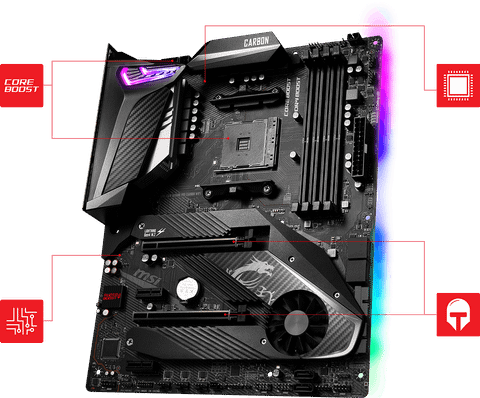 - Trải nghiệm trò chơi nhanh như chớp: PCIe 4.0, Lightning Gen4 x4 M.2 với M.2 Shield Frozr, StoreMI, AMD Turbo USB 3.2 GEN2